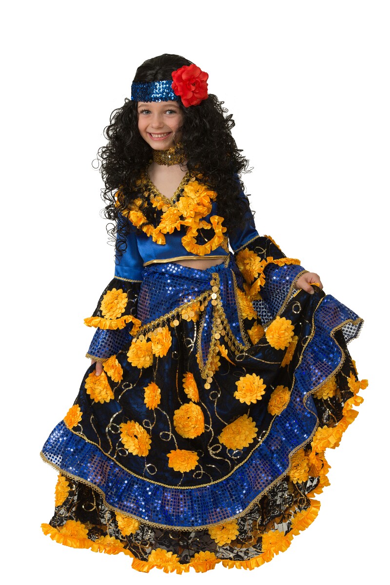 В комплект костюма Цыганки-гадалки для девочки входят:блуза, роскошная юбка с оторочкой блёстками, косынка на бёдра с блёстками, головной убор, парик.