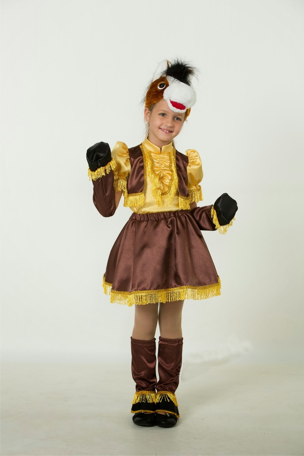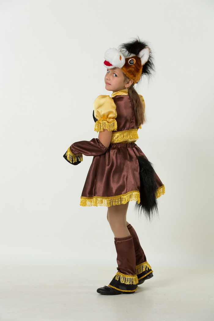 В коплект костюма Лошадка Сильва для девочки входят:блузка-жилет, юбка, нарукавники-копыта, гетры-копыта,маска-шапочка.