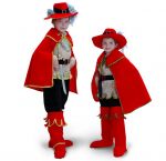 В комплект входят:- шапочка-маска со шляпой,- камзол,- плащ,- пояс,- брюки с имитацией сапог,- рапира.